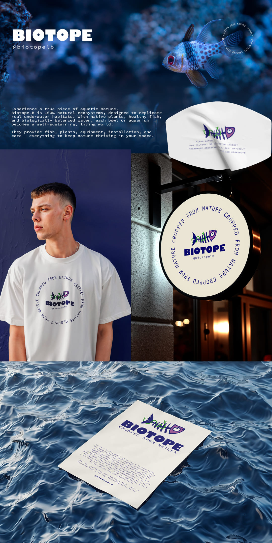 The BiotopeLB logo features a fish skeleton to represent structure, biology, and the unseen foundation of true aquatic life, reflecting the brand’s commitment to authentic, natural ecosystems rather than decoration. The skeleton’s body wrapped in greenery symbolizes renewal and balance, with life growing from structure just as it does in a real biotope. The dark aesthetic evokes the depth of underwater environments, where light reveals life emerging from darkness, expressing BiotopeLB’s essence as raw, living aquatic nature.